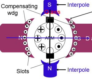 Interpoles or compoles are small poles fixed to the yoke and are placed in between the main poles. These poles are connected in series with the armature so that they carry full armature current. Their polarity is same as that of the main pole. They induce an e.m.f. in the coil under commutation known as commutating e.m.f or reversing e.m.f (reversal of current).